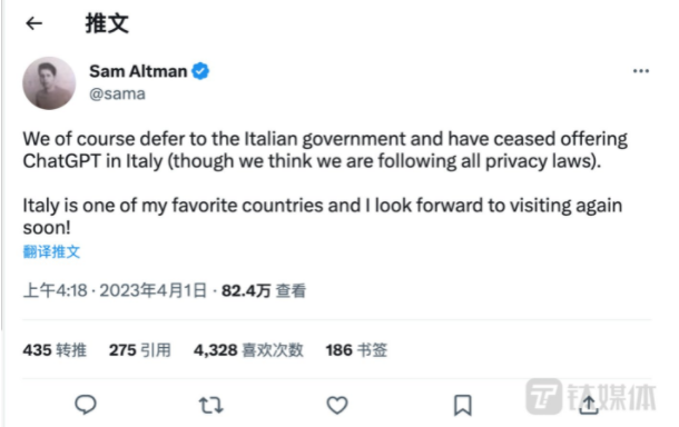 钛媒体App获悉,北京时间4月1日,ChatGPT之父、美国OpenAI公司CEO阿尔特曼(Sam Altman)发文证实,ChatGPT已经在意大利暂停服务,并表示意大利是他最喜欢的国家之一,期待着很快再次访问。