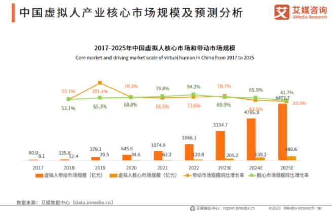 iiMedia Research(艾媒咨询)数据显示,2022年中国虚拟人带动产业市场规模和核心市场规模分别为1866.1亿元和120.8亿元,预计2025年分别达到6402.7亿元和480.6亿元,呈现强劲的增长态势。随着娱乐需求的增加,AI等技术不断迭代的环境下,中国虚拟人产业高速发展,元宇宙的热潮加速推动虚拟人产业升级。