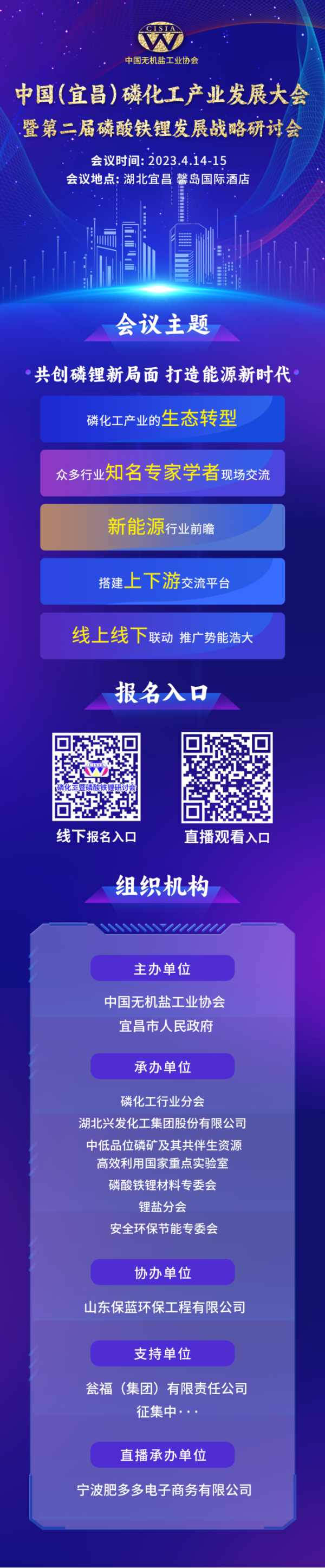 双碳背景下,聚焦做绿产业,先立后破,积极稳妥推进“双碳”行动,推动能源清洁低碳高效利用,已经成为目前经济发展的必然选择。宜昌地处长江中上游结合部,是长江重点生态区的核心组成部分、长江中下游的重要生态安全屏障和长江经济带高质量发展的重要战略支点,又是全国重要的磷化工基地。为进一步推动磷化工产业转型升级,促进磷系新能源材料发展,此次磷化工产业发展大会暨第二届磷酸铁锂发展战略研讨会(以下简称2023磷化工产业发展大会)定于2023年4月14日,在湖北宜昌市召开。