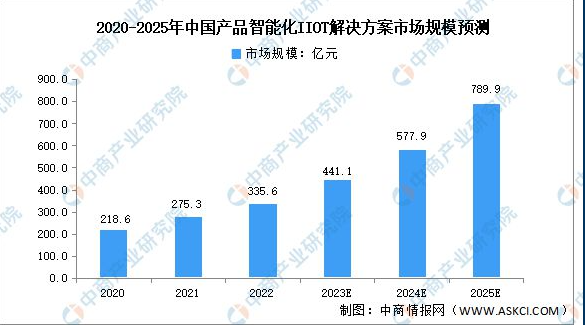 近年来,我国产品智能化IIoT解决方案市场规模呈增长趋势,2022年达335.6亿元,预计2025年将增长至789.9亿元,2021-2025年复合年均增长率达30.1%。