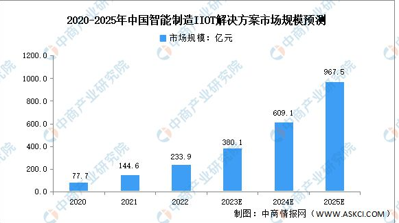 2022年,智能制造IIoT解决方案市场规模为233.9亿元,并将于2025年达到967.5亿元。2021年到2025年期间,智能制造IIoT解决方案市场规模年复合增长率为60.8%