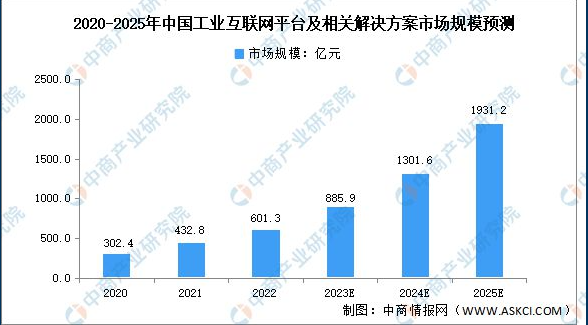 目前,中国工业互联网平台尚处于发展初期的普及阶段,将逐步迈入高速发展时期。2022年,中国工业互联网平台及相关解决方案市场规模达到601.3亿元,并将在未来保持高速增长,预计2025年市场规模将达到1931.2亿元。