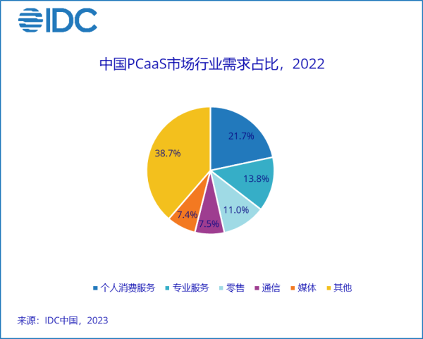 IDC数据显示,2022年全市场前五大行业占据了PCaaS市场超过60%的需求量。中国的PCaaS市场当中,以个人消费服务行业的需求量最高,占21.7%的市场份额,其中以餐饮、酒店、中介服务等细分市场的低端PC使用需求为主;专业服务的需求量占13.8%排名第二,其中如互联网行业的软件开发等也会带动相关高端PC需求。