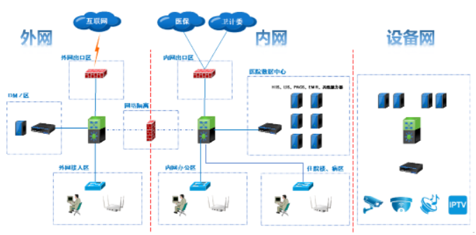 国内大部分医院网络一般分为三张网,分别是内网、外网和设备网,三张网络通过逻辑隔离、物理隔离的方式进行隔离。