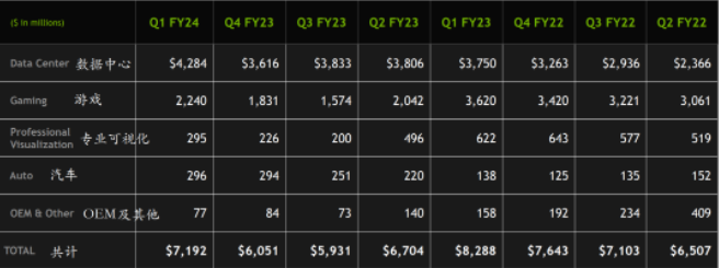 英伟达2022财年第二季度至2024财年第一季度各部门营收