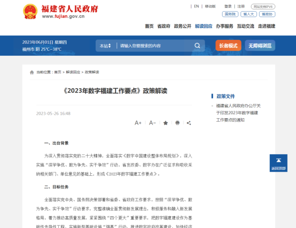 近日,为深入贯彻落实党的二十大精神,全面落实《数字中国建设整体布局规划》,深入实施“深学争优、敢为争先、实干争效”行动,福建省发改委、数字办在广泛征求和吸收采纳相关部门、单位意见的基础上,形成《2023年数字福建工作要点》。