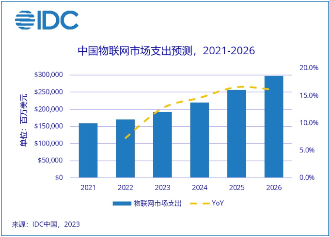 整体来说,以人工智能、物联网、云服务为核心的新技术为各行业注入创新活力,驱动智能化转型升级,蕴藏着万亿市场机遇。其中,企业物联网支出不断提高。IDC预测,到2026年,全球物联网(企业级)支出规模将达到1.1万亿美元。我国作为重要物联网市场,IDC预计,到2026年我国物联网将达到2981.2亿美元,将会成为全球最大物联网市场。