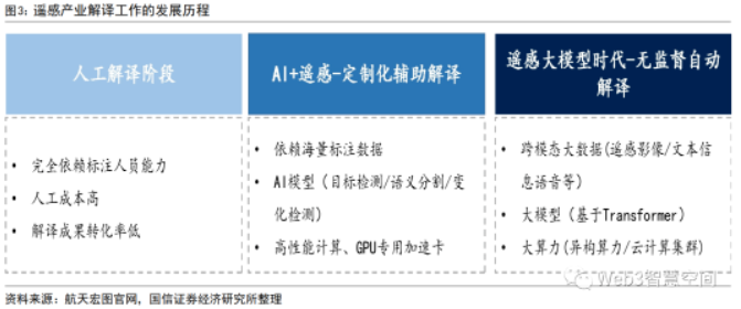 2)AI+遥感阶段,此阶段AI技术已经对遥感图像处理有一定的帮助,通过AI模型以及算力的支持,帮助解译工作提高效率,有效实现了人机协同,同时遥感、测绘等对比观测平台及卫星数量不断增长,AI+遥感的结合有效缓解了图像解译的工作痛点;