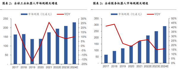 软硬件技术为机器人发展提供坚实基础,整体机器人市场规模呈现逐年提升趋势。随着互联网、计算机技术不断发展,机器人逐渐从机械自动化向人工智能化方向前进,机器人技术逐渐成熟,应用领域不断扩展,不断提升工业等场景自动化水平和智能化水平,机器人市场规模呈现上升趋势。1)工业机器人方面,随着国产工业机器人的发展,国内机器人逐步渗透到以往自动化水平较低的领域,不断提升我国制造业自动化水平;2)服务机器人方面,随着国内互联网等企业的入局,应用市场逐步多元化,如智能配送、家庭机器人、AI教育等。从市场规模来看,全球工业机器人市场规模呈现稳步增长趋势,2021年市场规模为175亿美元,IFR预计2024年全球工业机器人市场规模有望达到230亿美元;服务机器人整体保持较高速增长,2021年市场规模为172亿美元,IFR预计2024年全球工业机器人市场规模有望达到290亿美元;特种机器人方面,2021年市场规模为82亿美元,IFR预计2024年全球特种机器人市场规模有望达到140亿美元。