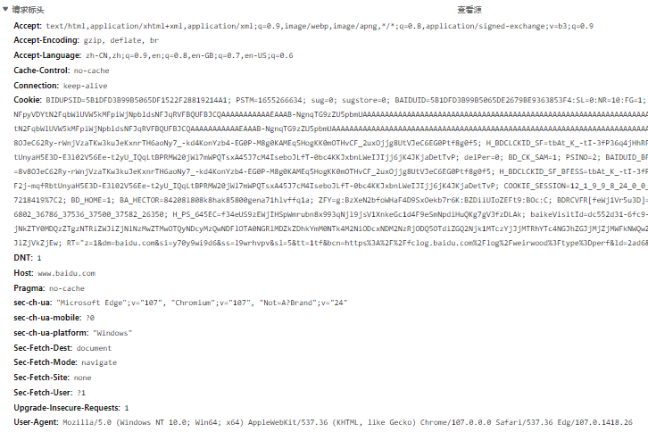 这种措施主要是针对爬虫程序启动时没有完全模拟浏览器头部信息的情况。比如打开Edge浏览器的开发者工具,在网络面板刷新页面后可以抓到网络数据包,打开访问百度页面的数据包,可以看到大量请求标头: