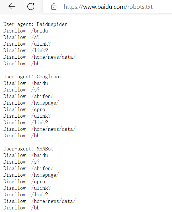 目前应用最广的网络条款是robots.txt,其目的在于告诉爬虫机器人网站的哪些页面可以爬取,哪些页面不允许被爬取,该条款只用于声明,而不能强制迫使网络爬虫遵循其规定。如下图是百度的部分robots.txt:
