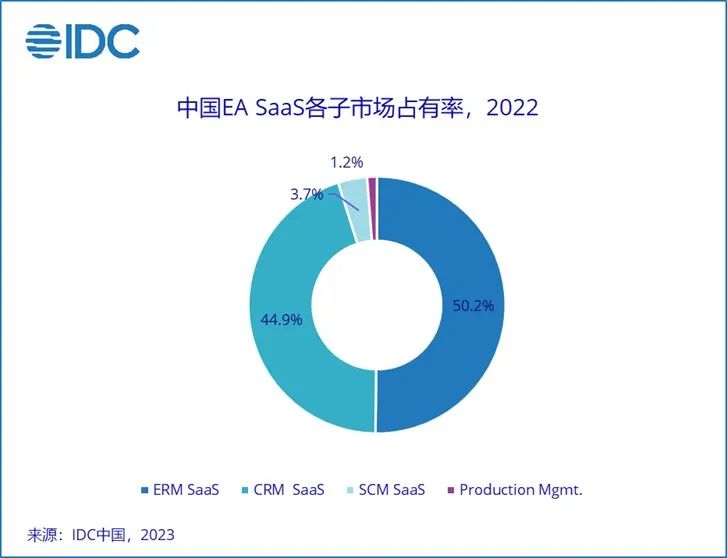 从市场的份额来看,2022年ERM SaaS市场占比最高,占整体EA SaaS市场的一半,其中像HCM SaaS、费控管理SaaS、项目管理SaaS等应用增速较快,并且HCM SaaS市场格局已经拉开。其次是CRM SaaS市场,在这其中以SFA SaaS(销售自动化)为主,未来会在营销类应用的SaaS,像CDP,营销自动化等市场迎来快速的发展。在SCM和制造生产类应用市场目前依旧以传统部署模式为主。