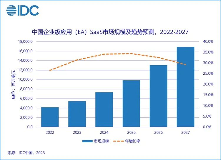 IDC(国际数据公司)最新发布的《2022年下半年中国企业级应用SaaS市场跟踪报告》中显示,2022年中国EA SaaS市场规模达41.6亿美元,同比增长26.6%。IDC预计,到2027年,中国EA SaaS市场规模将达到169亿美元,以32.4%的CAGR快速增长,引领整个SaaS市场持续稳定发展。2022年全年宏观经济环境不确定性因素较多,各行业发展均受到不同程度的影响,对中国EA SaaS市场也带来了一定的影响,增速不如预期。但是随着经济的逐渐恢复,2023-2025年这几年中国EA SaaS市场会迎来一定的增长。