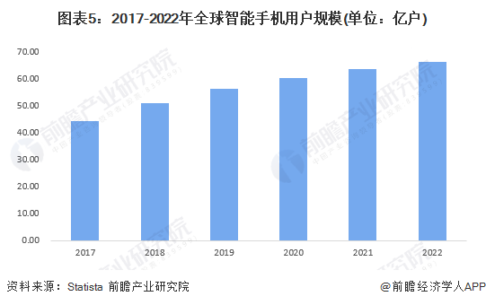 全球手机用户规模降速增长。根据Statista统计数据显示,2017-2022年全球手机用户总规模呈现稳定的逐年上升趋势,但增速呈现不断下滑的趋势。2021年全球手机用户为63.78亿用户,同比增长5.3%;2022年全球智能手机用户规模进一步提高至66.48亿,同比增长4.2%。