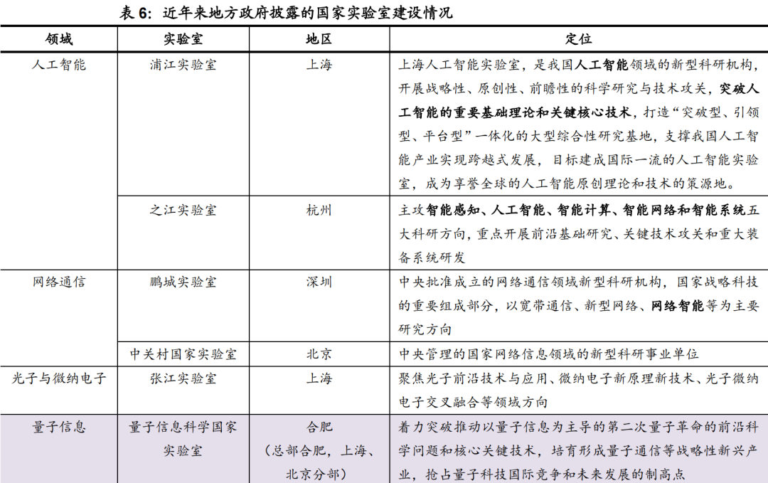 国家实验室作为国家最高科研水平的代表,目前科技部披露一共14个(另有6家被降级为国家重点实验室),都是2006年及以前批准筹建的,后续很长时间没有新的增量。近年来,根据地方披露了部分国家实验室建设的信息,我们统计到的12个新建国家实验室中,就有6个聚焦在信息科技领域,其中的2个都是重点聚焦了人工智能领域。