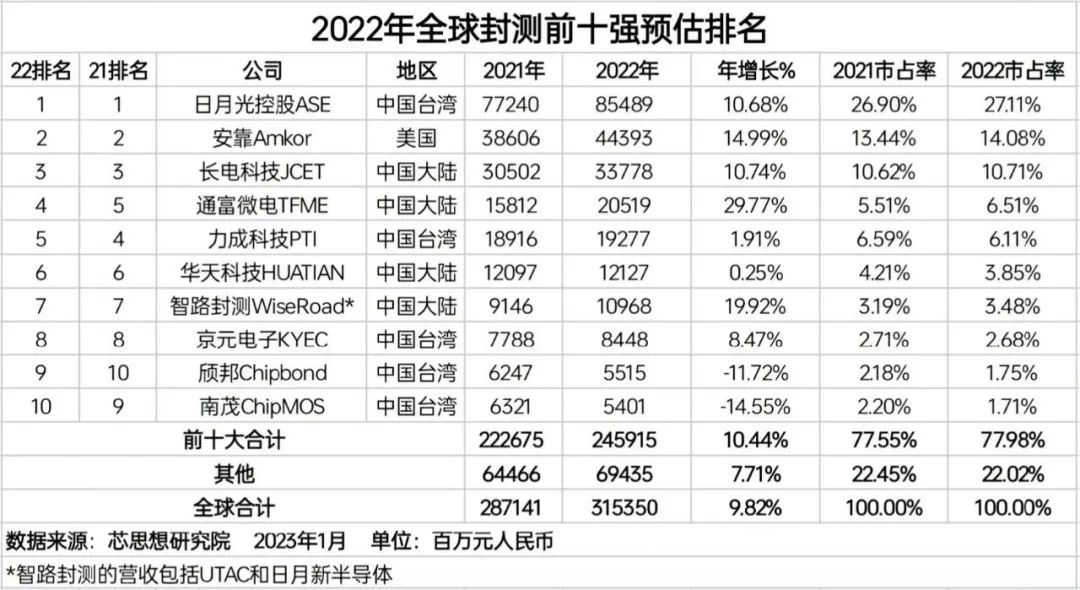 封测阶段是半导体产业链后段的核心,根据2022年全球前十封测厂商预测,中国台湾有5家、中国大陆有4家、美国1家,合计市占率77.98%。中国台湾地区有日月光控股、力成科技、京元电子、欣邦、南茂,中国大陆地区是长电科技、通富微电子、华天科技、智路封测,美国是安靠。