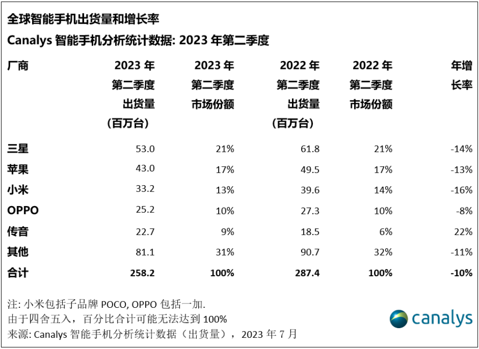 Canalys最新研究显示,2023年第二季度全球智能手机市场下降10%至2.582亿部,下滑趋势放缓。