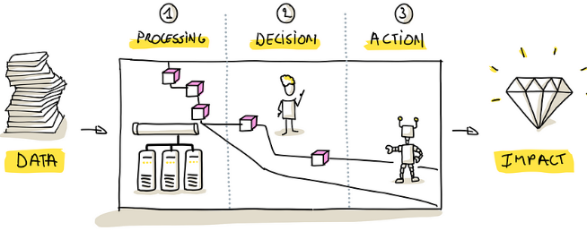 数据影响框架说明了这三个参与者如何协作将原始数据转化为切实的结果。最初,自动化管道处理和准备数据产品。接下来,人分析这些数据并做出明智的决策,从而采取有影响力的行动。人工智能和自动化管道可以帮助人无缝优化决策过程。在某些情况下,整个数据到行动的过程可以通过管道和人工智能完全自动化,无需任何人工干预。