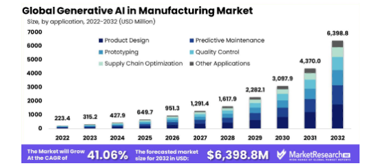 大模型的崛起并没有对人工智能在制造业的应用范式引起根本性的变革,但是在不同的环节增添了特定的需求,例如在算法层面,基于Transformer、U-Net等架构的基础模型成为生成式人工智能进入制造领域的基础;在通用支撑技术领域,向量数据库、MaaS等也成为重要的数字基础设施;在工业知识及经验领域,不同以往对时间序列等结构化数据的需求,生成式AI对高质量文本、图片、文档等数据的要求不断提升。虽然大模型仍在原有的范式下进行应用,但是大模型技术会不断的拓展人工智能在工业领域应用的空间,根据埃森哲测算,Al可以在2035年将制造业的附加值提高近4万亿美元,根据Marketresearch预测,到2032年,全球生成式人工智能制造市场规模将达到63.98亿美元。