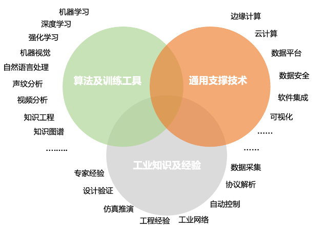 工业人工智能的应用范式已经成型,一是需要深度学习、强化学习等数据科学算法,计算机视觉、自然语言处理、语音识别等面向领域的算法,知识图谱、专家系统等知识工程,例如通过计算机视觉来构建产品外观检测的模型,基于强化学习进行排产规划模型的构建,借助知识图谱构建设备运维服务。二是需要通用支撑技术保障人工智能应用在制造业的部署和推理,例如边缘计算、高性能计算等技术保障现场的推理速度,时序数据库、大数据平台等保障数据的有效管理和接入。三是需要工业领域知识及经验实现人工智能应用与工业场景的适配,例如在模型训练的时候需要专家经验的介入实现调优和优化,在部分场景下需要机理模型和人工智能模型的结合才能发挥作用,在生产现场模型的部署和实施也需要和自动化的设备、工业软件等进行集成。