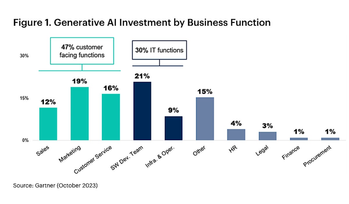 45%的受访者表示,他们正在跨多个业务功能扩展生成式AI投资,其中近一半(22%)正在跨多个功能部署该技术。软件开发、市场营销和客户服务(聊天机器人)是生成式AI应用或投资比例最高的领域。