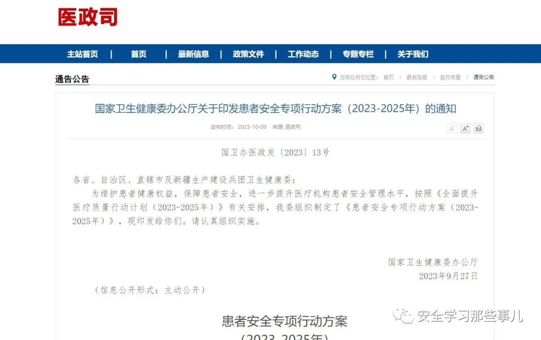 2023年10月9日,为维护患者健康权益,保障患者安全,进一步提升医疗机构患者安全管理水平,国家卫生健康委制定并发布《患者安全专项行动方案(2023-2025年)》(以下简称《行动方案》)。点击阅读原文查看全文