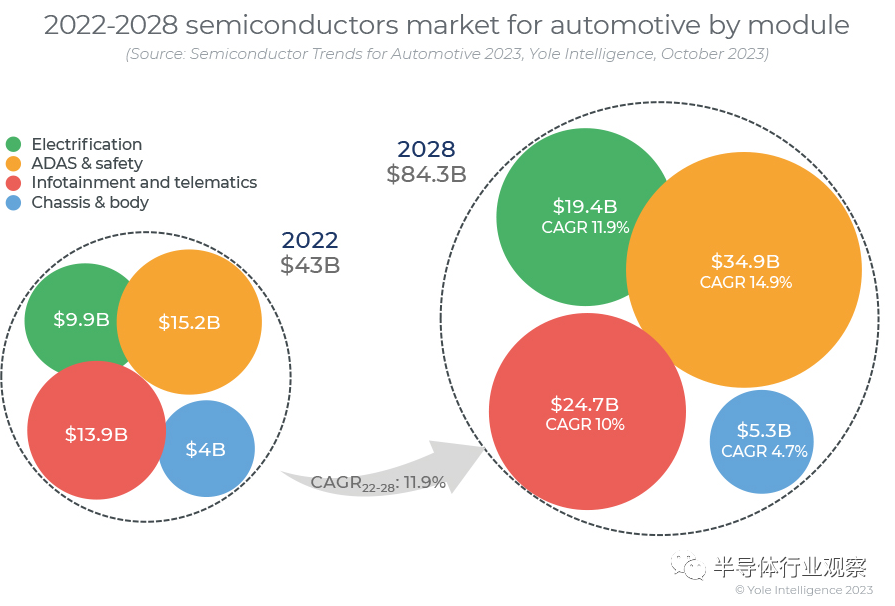 据Yole介绍,汽车半导体器件市场将从2022年的439亿美元增长到2028年的843亿美元,复合年增长率高达11.9%。目前的市场表明,到2022年,每辆汽车的半导体器件价值约为540美元,到2028年,该数字将增长至约912美元,而电动化和ADAS是技术变革的主要驱动力。
