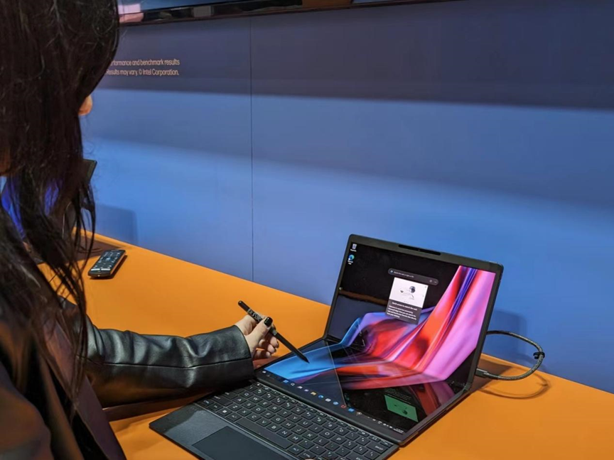 消费者在体验OLED折叠屏笔记本电脑