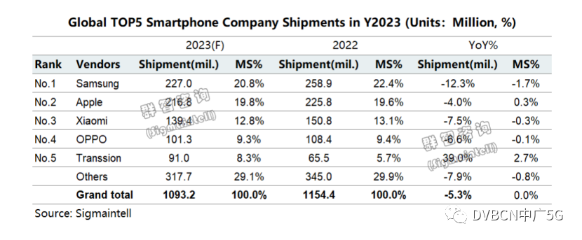 根据群智咨询(Sigmaintell)最新预测,2023年全球智能手机市场的出货量约10.9亿部,同比下降5.3%,2024年全球智能手机市场的出货量约为11.1亿部,同比增长1.8%。