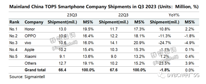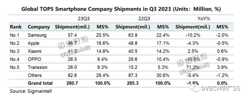 报告显示,2023年第三季度全球智能手机出货量约为2.80亿部,同比下降约1.6%,中国大陆市场出货量约为6640万部,同比下降约1.8%。