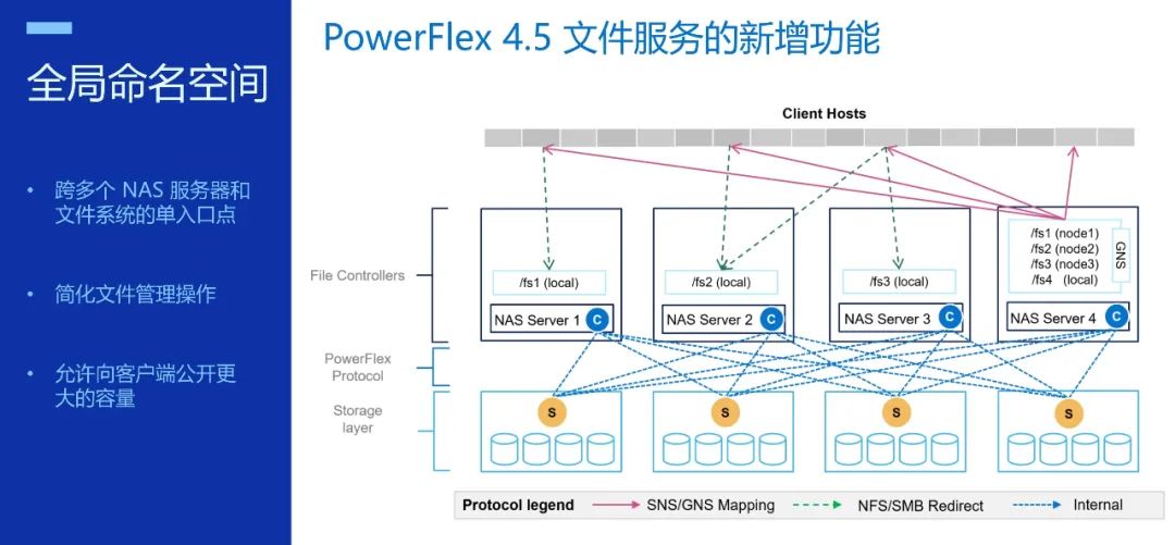 Dell PowerFlex 4.5可以利用多个物理节点上的多个NAS并发,提升处理性能。凭借强大的基于策略的全局命名空间,Dell PowerFlex 4.5能够跨越多个NAS服务器和文件系统的单入口点,实现全局的配额、管理,从而简化文件管理操作,并可以向客户端公开更大的容量。特别值得一提的是,Dell PowerFlex 4.5所有内部的处理流程都已经容器化,这样更便于升级,适应不同的变化,实现负载的均衡。