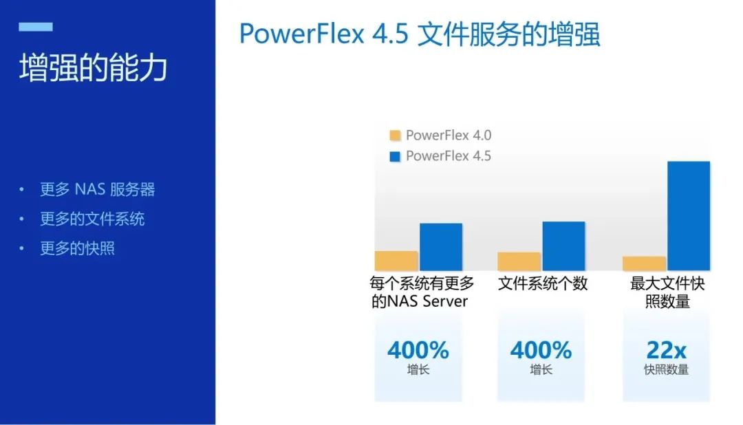 在Dell PowerFlex 4.0版本之前,已经覆盖了块存储和文件存储,能够稳定支撑客户中常见的所有架构。Dell PowerFlex 4.5最大的亮点在于,进一步提升了文件系统的能力。相比Dell PowerFlex 4.0,Dell PowerFlex 4.5每个系统拥有更多的NAS服务器,数量增长了400%,使得客户有更多NAS服务器承载不同的负载;文件系统的个数也增长了400%;最大文件快照数量是原来的22倍。
