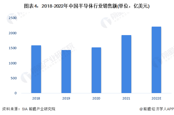目前中国是全球最大的半导体市场。2021年中国半导体销售额达到1925亿美元,在全球市场占比34.6%。同比增幅为27.1%,全球第三,仅次于美国(27.4%)和欧洲(27.3%)市场。初步测算,2022年我国半导体行业销售额为2214亿美元。