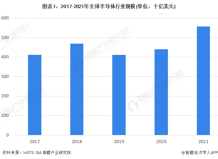 2017-2021年全球半导体行业市场规模波动变化,2019年存储芯片市场下滑严重导致全球半导体市场规模出现下降,2020年以来恢复增长。根据美国半导体产业协会(SIA)发布数据,2021年达到5559亿美元,较2020年增长26%。