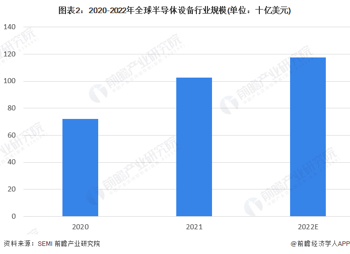 半导体设备方面,随着全球半导体市场的繁荣发展,半导体设备需求也在增长。2021年全球半导体设备市场规模达到1030亿美元,较2020年增长42.24%。SEMI预测,2022年全球半导体设备市场规模将达到1180亿美元。