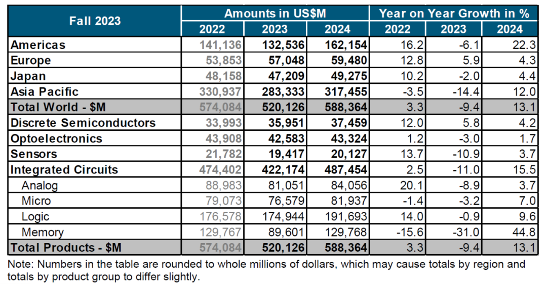 WSTS表示,尽管下滑幅度很大,但没有2023年5月份最初预测的那么明显。因此,他们预测2024年将会出现强劲复苏,预计增长13.1%,销售额有望达到5884亿美元,创历史新高。