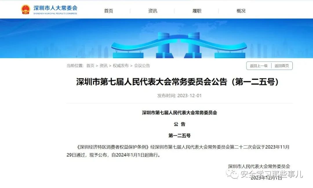 2023年12月1日,《深圳经济特区消费者权益保护条例》经深圳市第七届人民代表大会常务委员会第二十二次会议于2023年11月29日通过,现予公布,自2024年1月1日起施行。