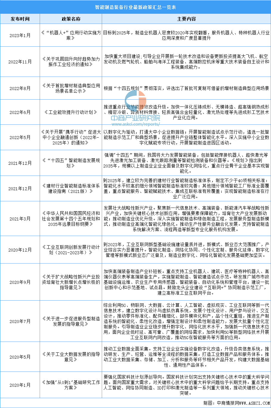 加快发展智能制造,是培育我国经济增长新动能的必由之路,是抢占未来经济和科技发展制高点的战略选择,对于推动我国制造业供给侧结构性改革,打造我国制造业竞争新优势,实现制造强国具有重要战略意义。为此,国家颁布了一系列有利于智能制造装备行业的产业政策,以促进行业的健康发展。具体政策内容如下图所示: