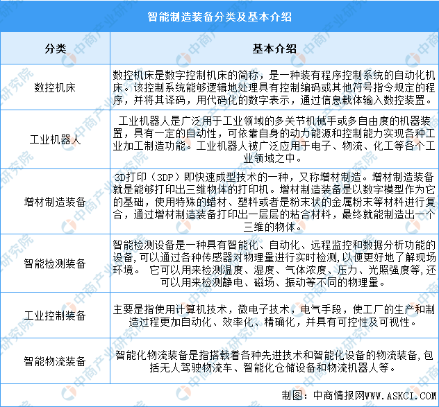 智能制造装备是指具有感知、分析、推理、决策、控制功能的制造装备,它是先进制造技术、信息技术和智能技术的集成和深度融合。通用智能制造装备包括数控机床、工业机器人、增材制造装备、智能检测装备、工业控制装备、智能物流装备等,具体如图所示: