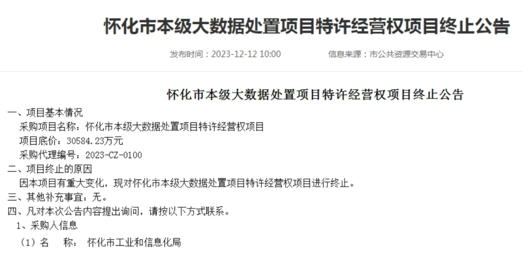 2023年12月12日,怀化市公共资源交易中心网发布怀化市本级大数据处置项目特许经营权项目终止公告,公告显示项目终止的原因:因本项目有重大变化,现对怀化市本级大数据处置项目特许经营权项目进行终止。该项目底价为30584.23万元。采购人为怀化市工业和信息化局。