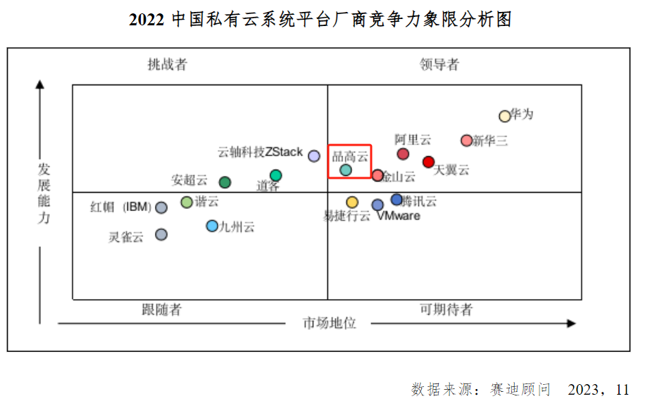 近日,赛迪顾问发布《2023中国私有云市场研究报告》(下文简称“报告”),品高云入选2022中国私有云系统平台厂商竞争力分析图领导者象限。此外,在互联网周刊12月12日公布的“2023私有云企业30强”榜单中,品高云位居前10。