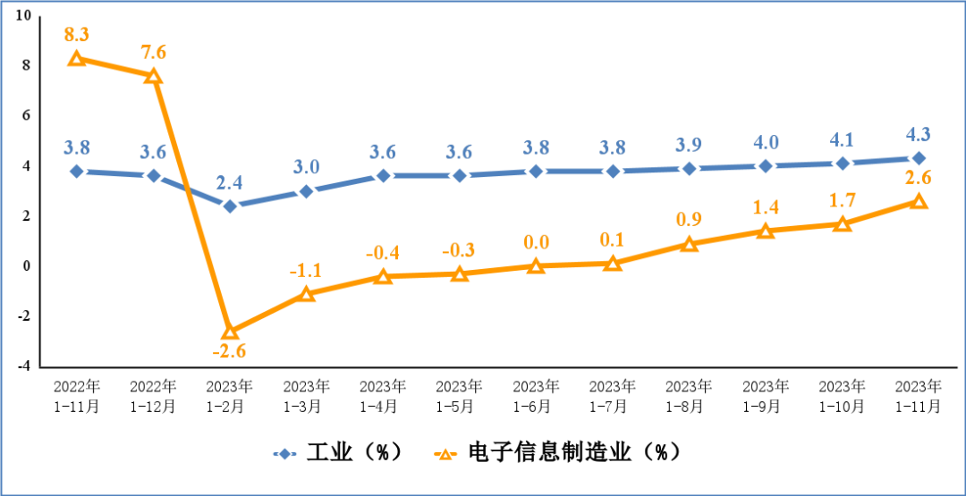 1—11月份,规模以上电子信息制造业增加值同比增长2.6%,增速较1—10月份提高0.9个百分点;增速比同期工业低1.7个百分点,比高技术制造业高0.3个百分点。11月份,规模以上电子信息制造业增加值同比增长10.6%。