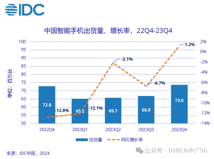 数据显示,2023年第四季度,中国智能手机市场出货量约7,363万台,同比增长1.2%,在连续同比下降10个季度后首次实现反弹。