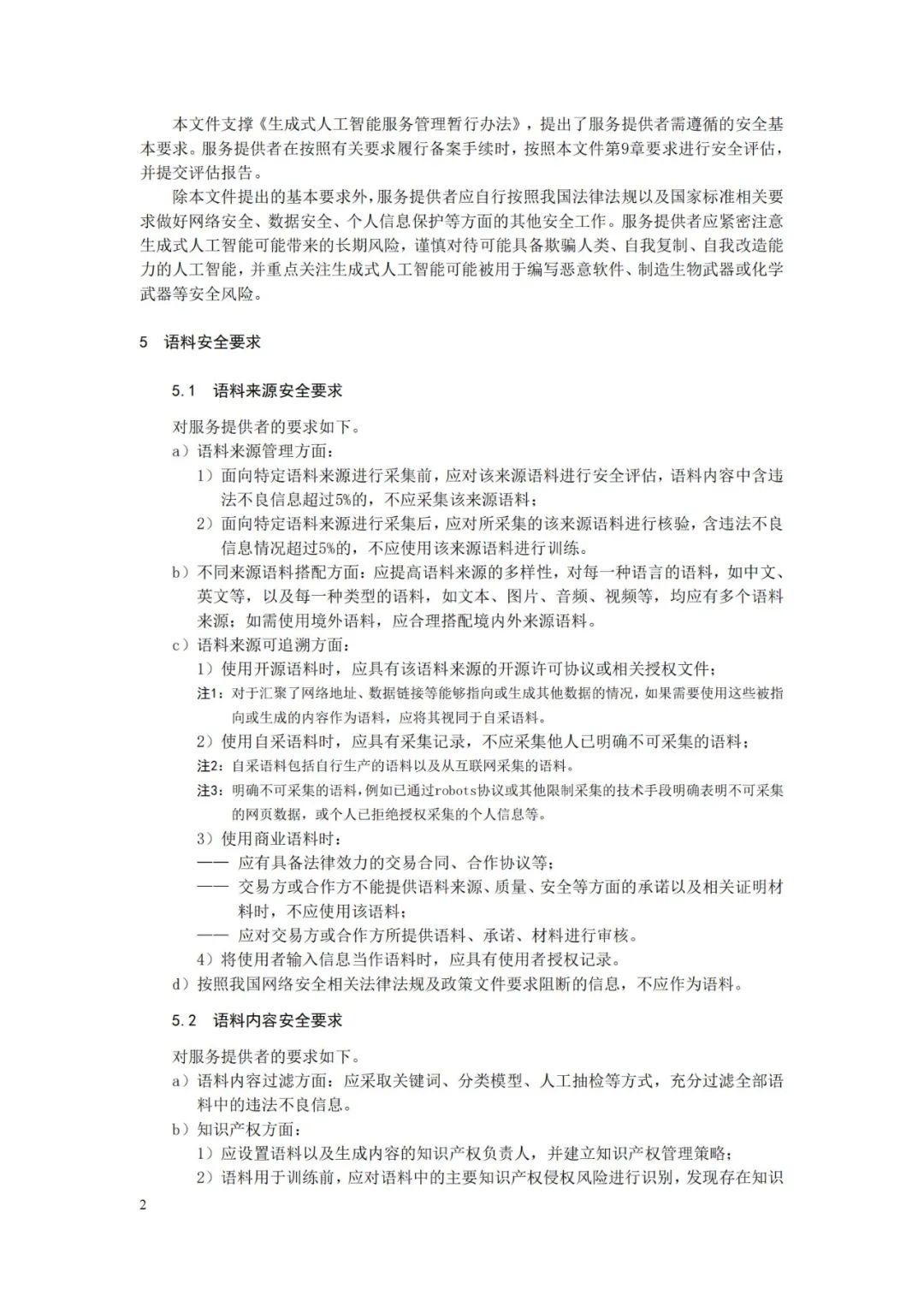 该文件支撑《生成式人工智能服务管理暂行办法》,提出了服务提供者需遵循的安全基本要求。服务提供者在按照有关要求履行备案手续时,按照本文件第9章要求进行安全评估,并提交评估报告。