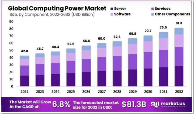 据market.us调查数据显示,2023年全球算力市场的价值为457亿美元,预计到2032年将达到813亿美元。在2023年至2032年期间,该市场预计将以6.8%的复合年增长率增长。
