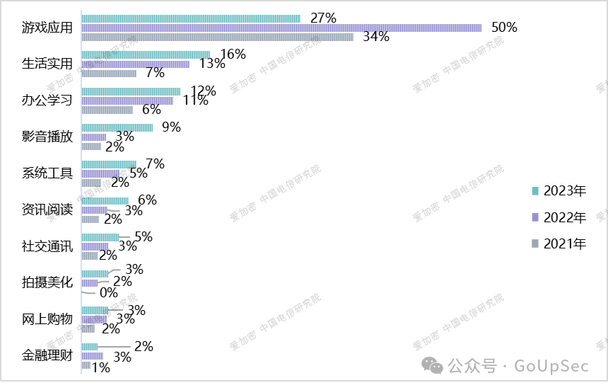 从功能类型来看,游戏应用类存在恶意应用的数量占全国恶意应用总量的49.66%,位居第一,远超其他类型应用。这类恶意软件可能会以广告软件的形式出现,通过弹窗广告干扰用户,或者更糟糕的是,利用用户浏览器的漏洞进行偷渡式下载,安装恶意程序到用户的设备上,模仿流行游戏的恶意软件和不需要的软件;详情见下图: