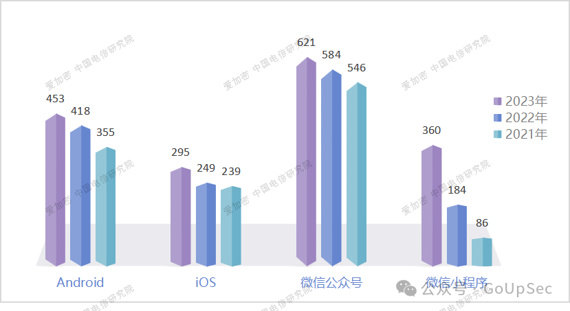 截至2023年,移动应用安全大数据平台收录全国Android应用共计453万款,iOS应用共计295万款,微信公众号621万个,微信小程序360万个。2023年年度,全国总计更新及新上架的应用共计27万款。
