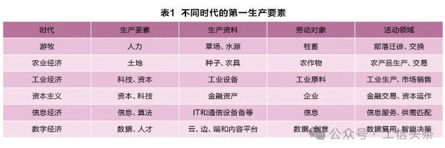 数据要素定义:数据要素是指在数字经济时代,数据作为一种关键的生产要素,它与土地、劳动力、资本等传统生产要素一样,对于推动经济增长和社会发展具有重要作用。数据要素的价值体现在其能够通过分析、处理和应用来创造新的商业模式、优化决策过程、提高生产效率,从而在经济活动中发挥乘数效应。如下图所示,不同时代,有不同的要素作为生产第一要素;然而,唯有到了数字经济时代,数据作为生产第一要素能够和其他要素结合起来,发挥倍增效应。