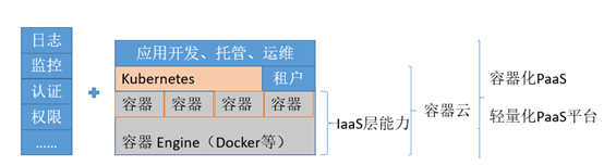 容器是一种操作系统级虚拟化技术,Docker是一种容器引擎。使用Docker来运行操作容器。但从容器自身来说,其提供的是IaaS层能力。Kubernetes提供了容器调度和管理的能力,加上云计算租户功能,实现容器云平台功能。而基于容器技术所构建的应用开发、应用托管和应用运维平台则可以称为容器化PaaS平台,它是一种轻量化PaaS实现。结合日志、监控、认证、权限等基础能力则可以构建企业级的平台和可复用服务,采用微服务架构实现企业技术服务中台能力,支撑企业业务敏捷研发和模式转型。