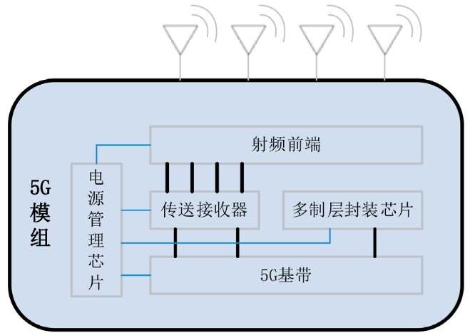 5G通信模组处于感知层与网络层之间,是将多种芯片器件进行封装设计并嵌入多种通信协议,能够快速为终端设备提供5G通信能力的核心电子元器件。5G通信模组主要由电源管理芯片、传送接收器、射频前端、多制层封装芯片、5G基带五部分组成,如图1所示。现有通用模组基本无法兼顾安全性、稳定性和特殊功能需求等指标,因而难以满足不同行业对5G的差异化需求。